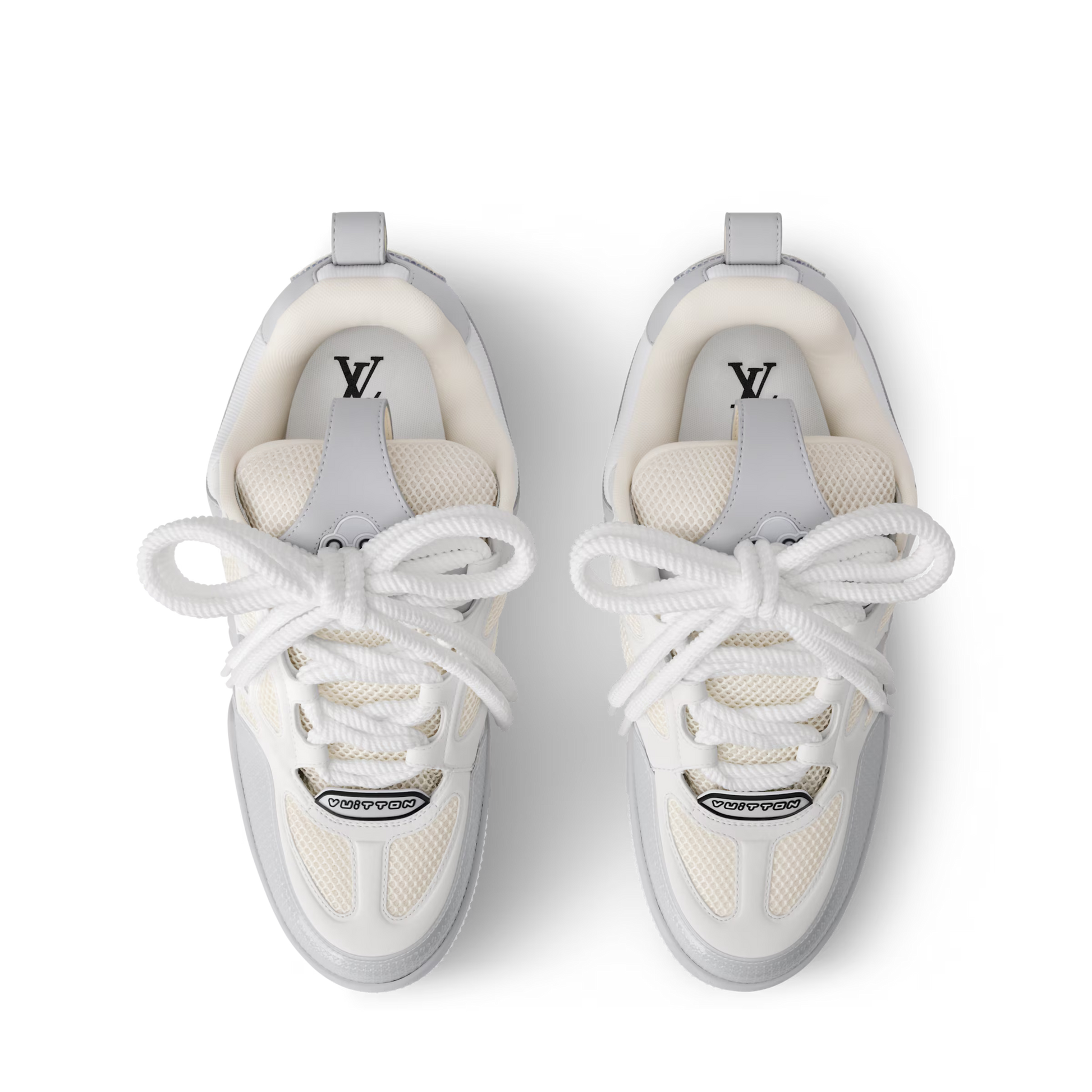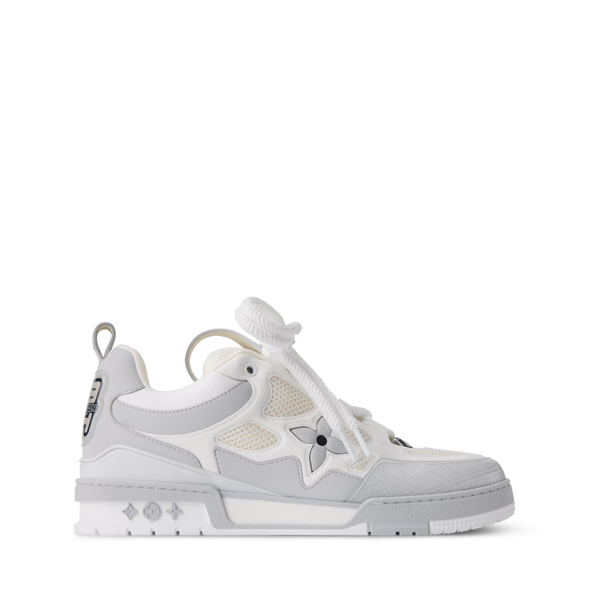 This colourblock version of the LV Skate Trainers comes in a mix of nubuck calf leather and technical mesh. Inspired by Nineties' skate shoes, this model is notable for its thick double laces and exaggerated, padded collar and tongue. It has an oversized Monogram Flower on the side and an LV Vuitton logo on the tongue.